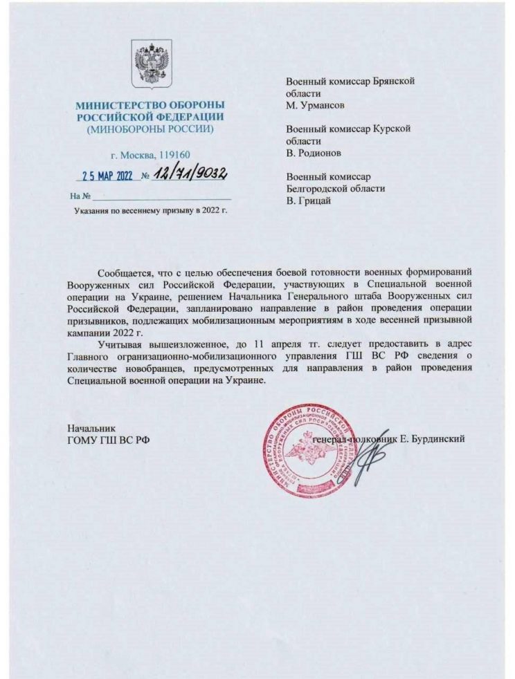 • Ma saan sellest käskkirjast aru nii, et Mordori üksuste lahinguvalmiduse tugevdamiseks ja „erioperatsiooni, mida ei nimetata sõjaks“ toetuseks, toimub 11. aprillil ajateenistusse kutsutute Kurski, Brjanski ja Belgorodi oblasti kutsealuste teenistus „erioperatsiooni alal“!Värske kahuriliha?