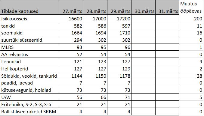 - Samas on nn “vägede väljaviimine” ilmselt üksikute üksuste rotatsioon ning selle eesmärk on eksitada Ukraina relvajõudude sõjalist juhtkonda ning luua väärarusaam okupantide loobumisest Kiievi piiramisest.