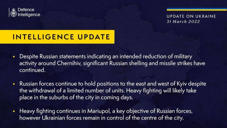 - Ukraina relvajõud vabastasid Tšernihivi oblastis Lukašivka ja Sloboda külad Venemaa sõjaväelaste käest, ütles piirkonna sõjaväeadministratsiooni juht Vjatšeslav Tšaus 31. märtsil.