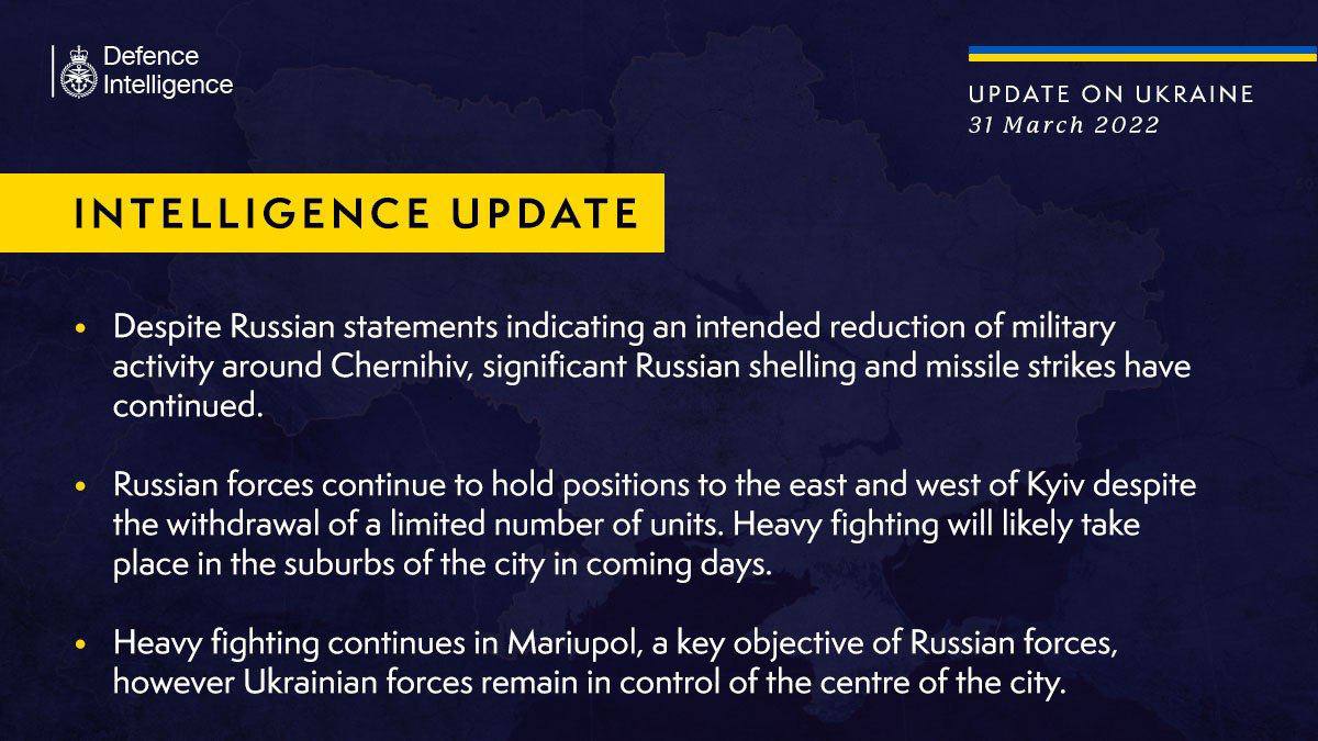 - Ukraina relvajõud vabastasid Tšernihivi oblastis Lukašivka ja Sloboda külad Venemaa sõjaväelaste käest, ütles piirkonna sõjaväeadministratsiooni juht Vjatšeslav Tšaus 31. märtsil.