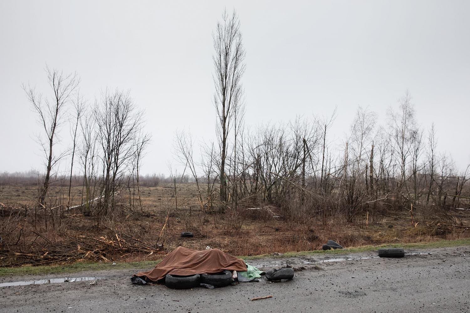 - Kiievist 20 km kaugusel kiirtee lähedal on näha hukkunud tsiviilisikuid. Teki all on 4-5 surnud alasti naist, keda vantidest barbarid sealsamas teeservas põletada üritasid.