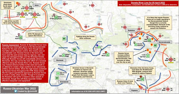 See, et UKR alustas juba üleeile elenike massevakueerimist Slovjanskit, Krematorskit ja teistest selle piirkonna linnadest, näitab et ukrainlastel palju illusioone pole. Ilmselt on ees oodata palju linnalahinguid mis venelastele tähendab paljuhukkunuid ja kaotatud tehnikat. Izumist läände venelaste pealetung ei õnnestunud küll aga on saavutanud mõningast edu Krematorski suunal. Idas ongi ukrainlaste vastupanu peamine raskuskese selles piirkonnas.  Ku venelased saavad selle maha surutud siis tee Dnepropetrovskini peaks neil olema oluliselt lihtsa. Ma hindan küll, et Luganski oblasti piir on üksnes vahe eesmärk. Peamine eesmärk on jõuda Dneprini.