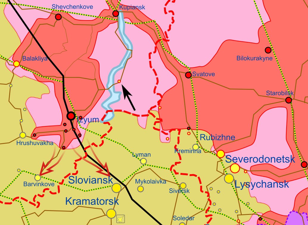 - Peamised lahingud olid eile idas. Lõuna suunas Borova juures (noolega tähistatud) ja Izumist läänes, Hrushovakha suunas. Lõunas, Hersoni lähistel puhastasid ukrainlased paar asulat vatnikest.