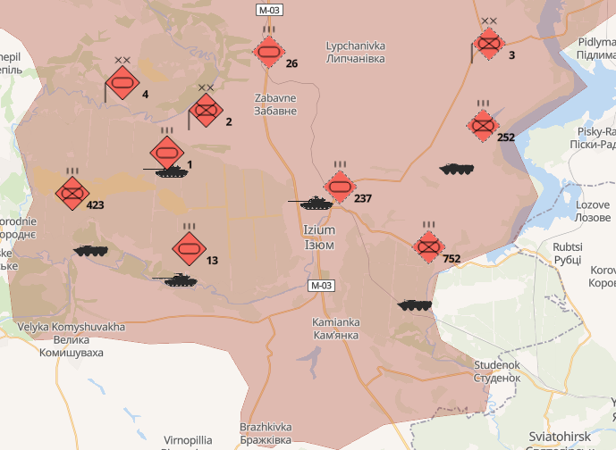 - Slobožanski suunal jätkavad Vene okupandid võitlust, kaasates 6. ja 20. üldarmee, Lääne sõjaväeringkonna 1. tankiarmee, 35. ja 36. üldarmee ning Ida sõjaväeringkonnast 68. armeekorpuse eraldiseisvad üksused. Piirkonnas on õhudessantväed, Balti- ja Põhjalaevastiku rannikukaitse üksused.