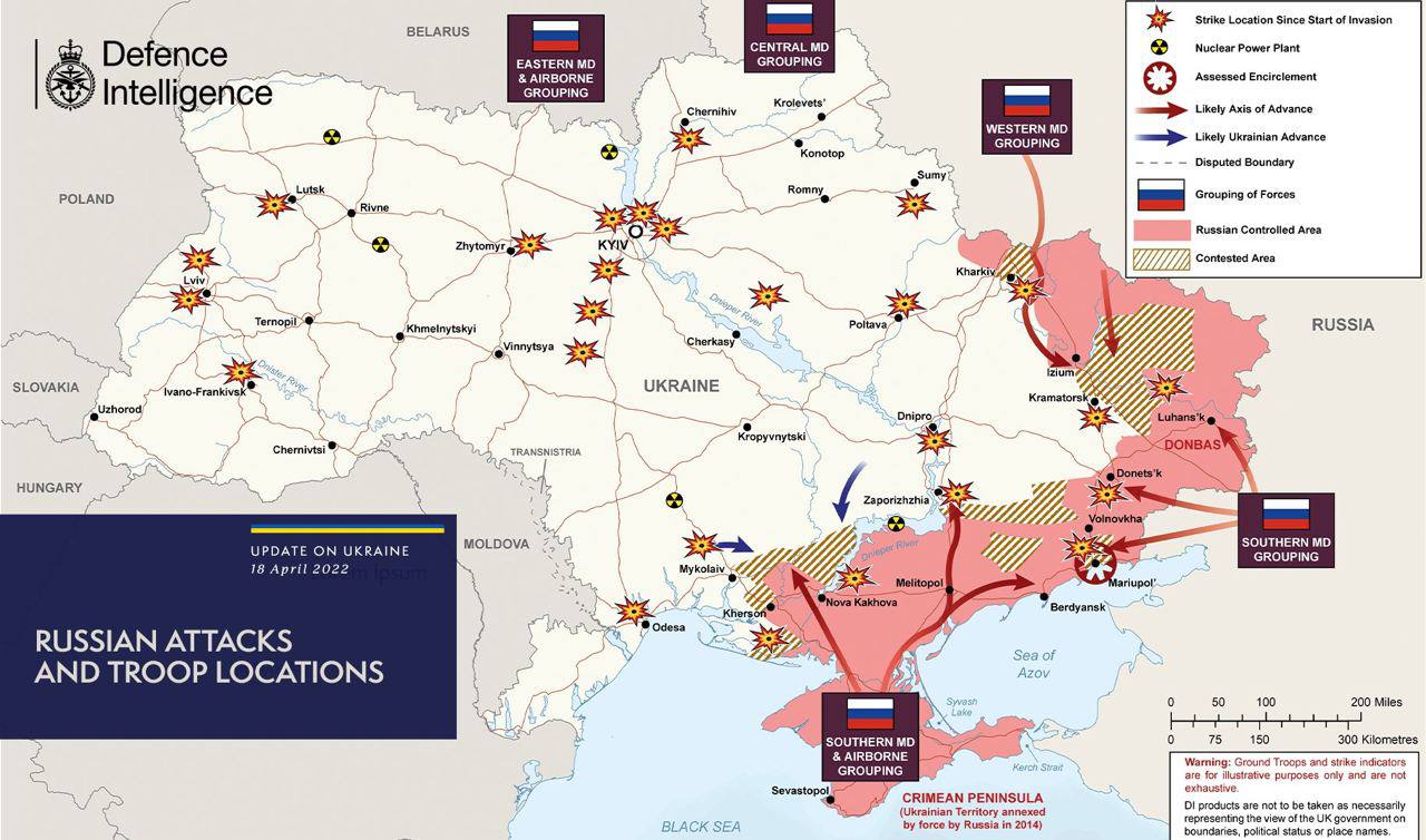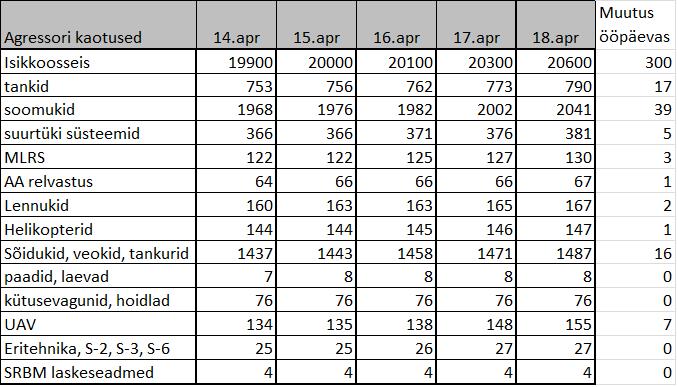 - Vaenlane jätkab täiendavate üksuste moodustamist Rostovi oblasti territooriumil ja okupeeritud Krimmi Autonoomse Vabariigi territooriumil. Neid plaanitakse kasutada teise ešeloni põhijõudude lahingutegevuse toetamiseks, administratiivhoonete ja oluliste taristuobjektide kaitsmiseks okupeeritud aladel. Olemasolevatel andmetel on eeldatav moodustamise tähtaeg käesoleva aasta 24. aprill.