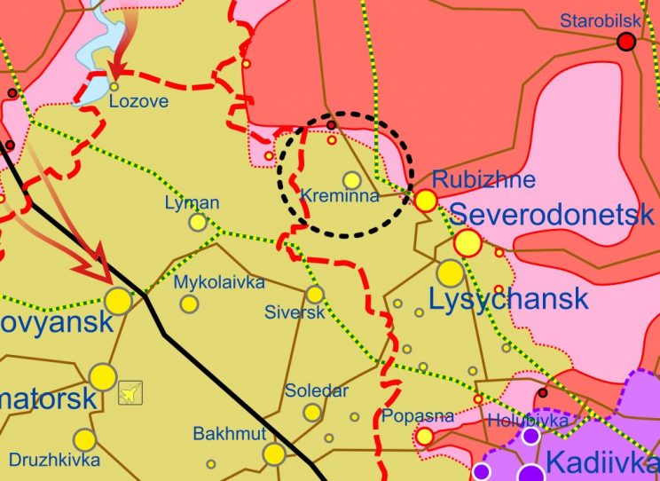 - Siverskys, Donetsi jõe vasakul kaldal asuva sillapea laiendamiseks ja tingimuste loomiseks vägede kiireks paigutamiseks teostas vaenlane luuret ning ründas Zavody, Dmytrivka ja Dibrovne asulaid.