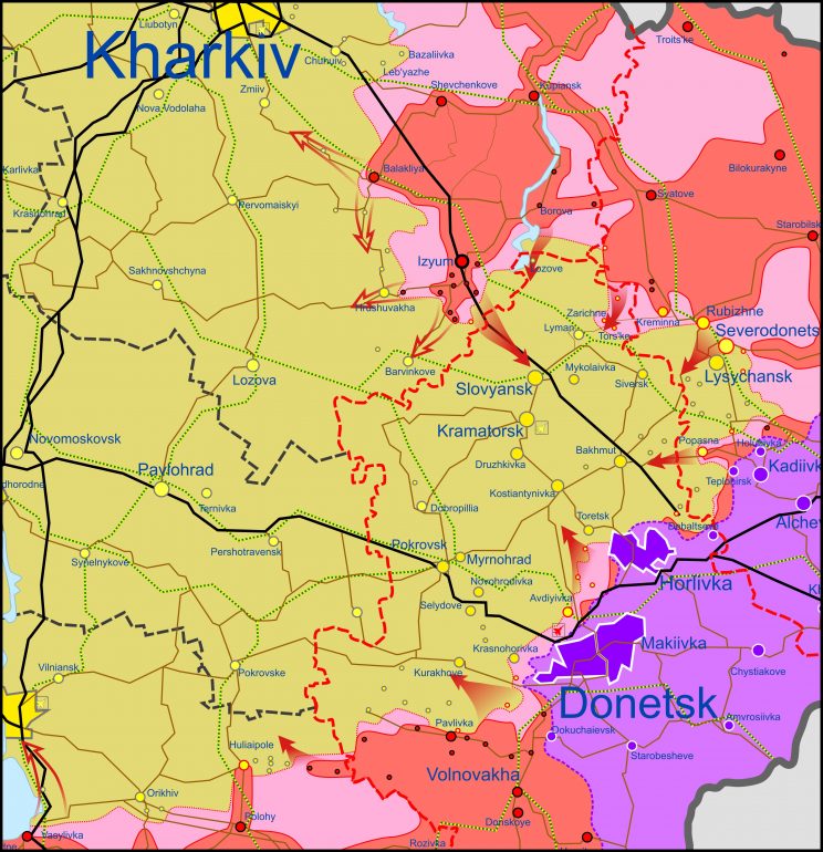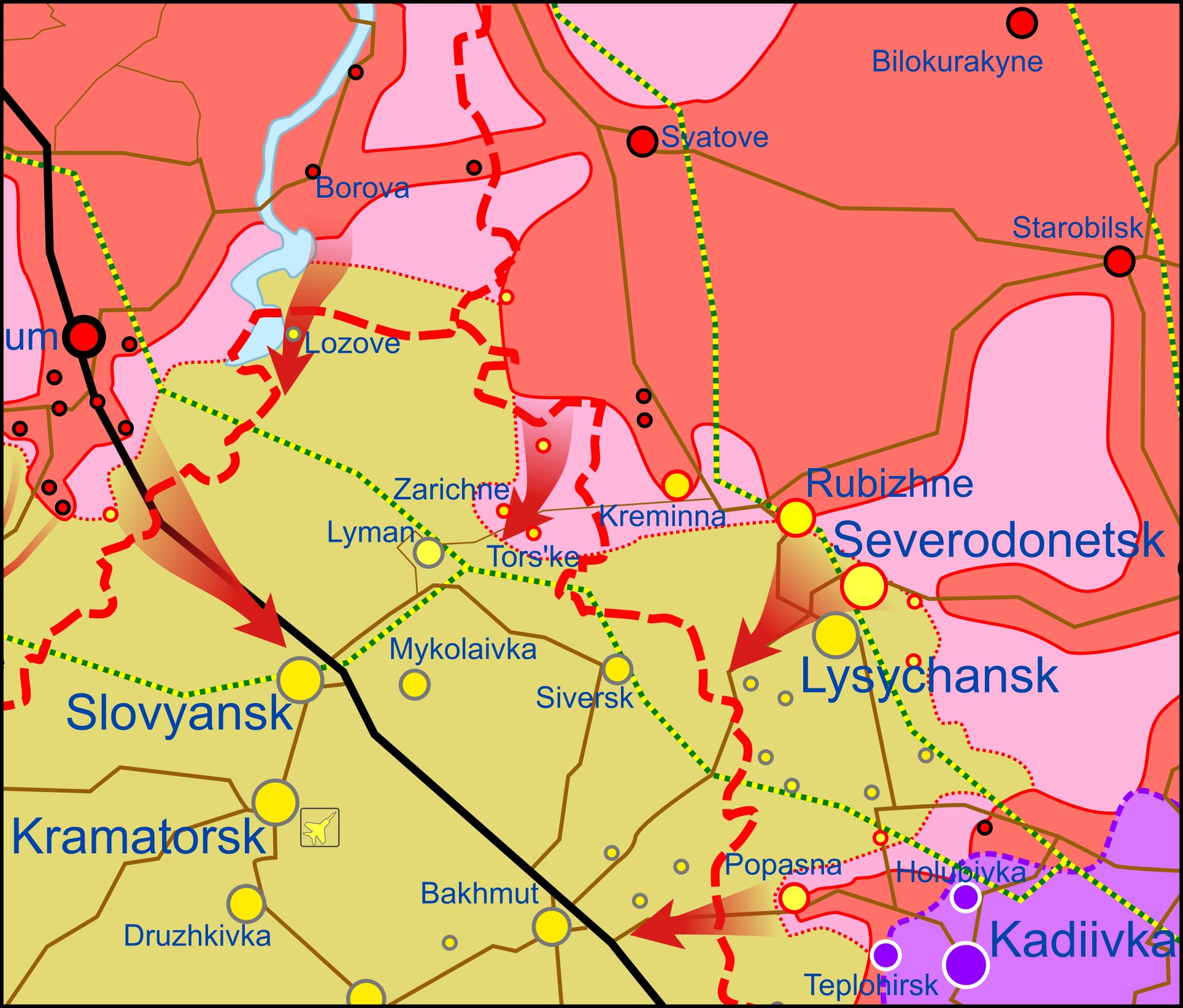 - Izyumi suunas teostab vaenlane pealetungi Donetsi jõe vasakul kaldal. Rühmituse ründetegevuse toetamiseks nimetatud suunal on vastane loonud suurtükiväe põhi- ja reservtulepositsioonide süsteemi. Vatnike Izjumi väegrupi suuruseks hinnatakse 25K.