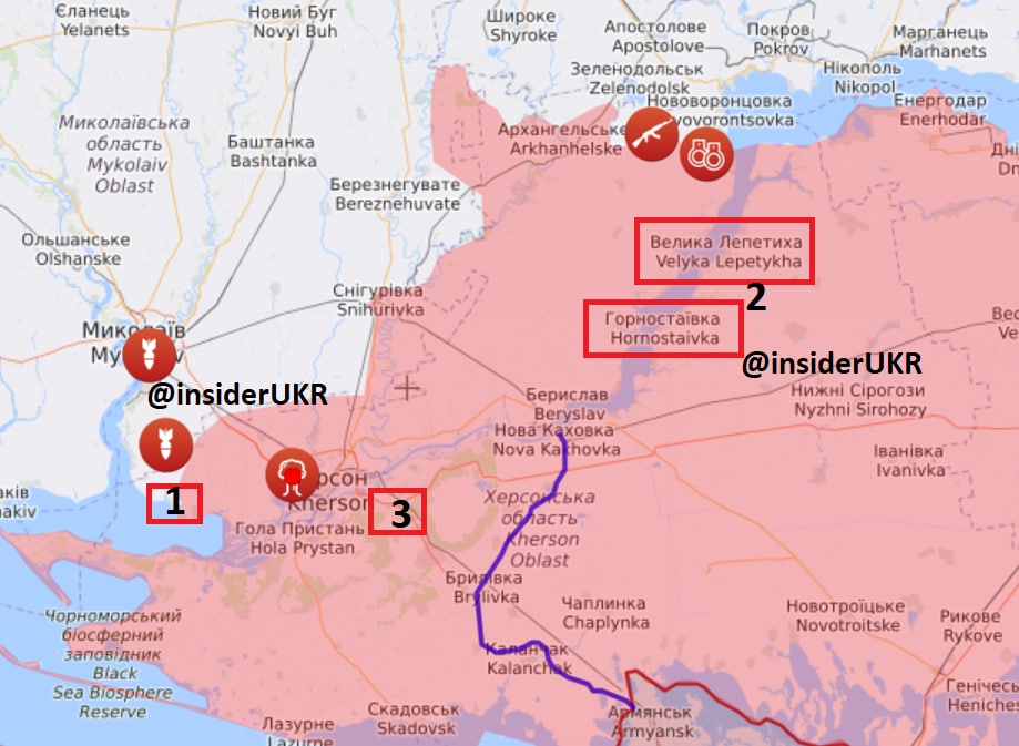- Lõunasuunal (Herson), Oleksandrivka asula piirkonnas, kaitseb vaenlane okupeeritud positsioone. Õhuluure läbiviimine. Ei ole välistatud Hersoni piirkonna halduspiiridest väljumiseks mõeldud pealetungi.