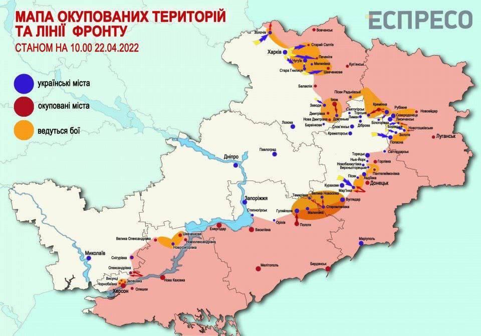 Arestovich. Hersoni juures õnnestus hävitada armee komandopunkt vanemohvitseridega, suur võit. Mõkolaist kirdes hävitati ka üks vatnike kolonn. Idas okupant liikus natuke edasi Zaporozje suunal ja natuke Izjumist Slovjanski suunas, järgmistesse küladesse.