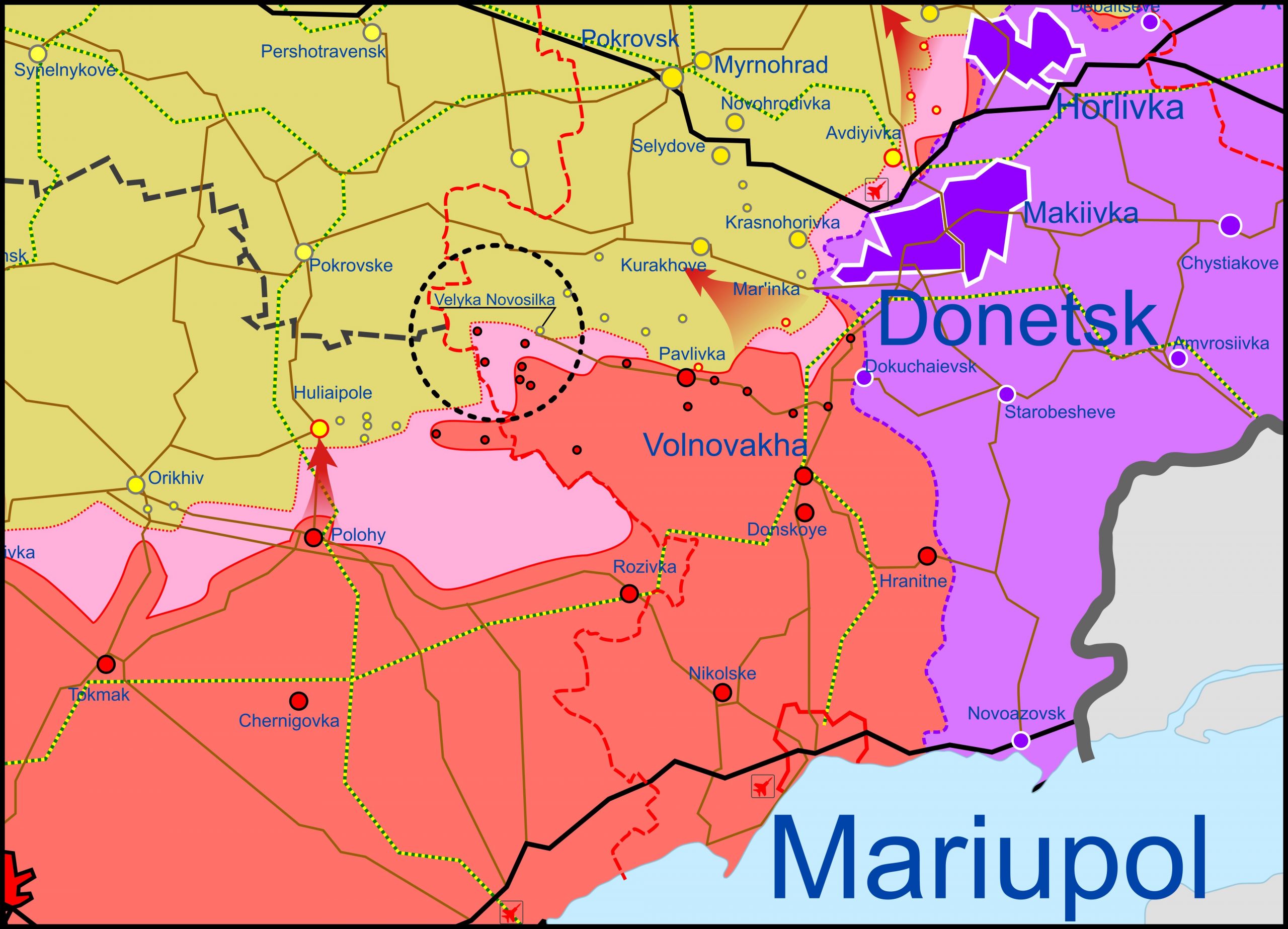 Tänased lahingutegevuse tsoonid on kaardile märgitud kollasega.