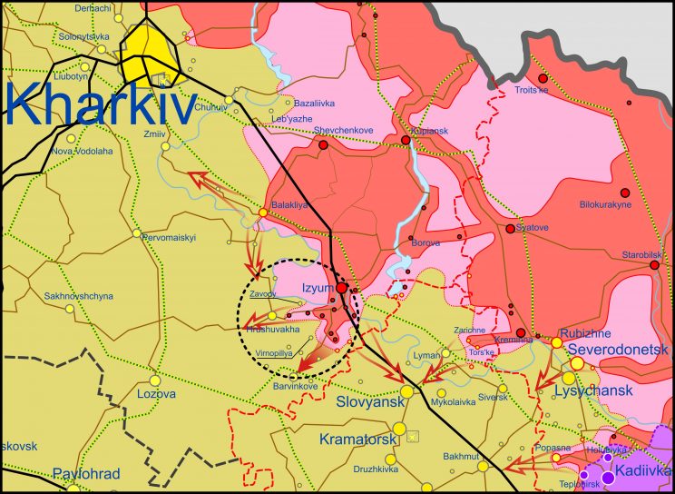 - Lääne sõjaväeringkonna 1. tanki ja 20. üldarmee, 35. üldarmee ja ida sõjaväeringkonna 68. armeekorpuse ja õhudessantvägede eraldised üksused juhivad pealetungi- ja ründeoperatsioone lõunas Izjumi piirkonnas. Vastane viib läbi positsioonide ja meetmete õhuluuret tuletoetuse ja üksuste logistilise turvalisuse korraldamiseks.