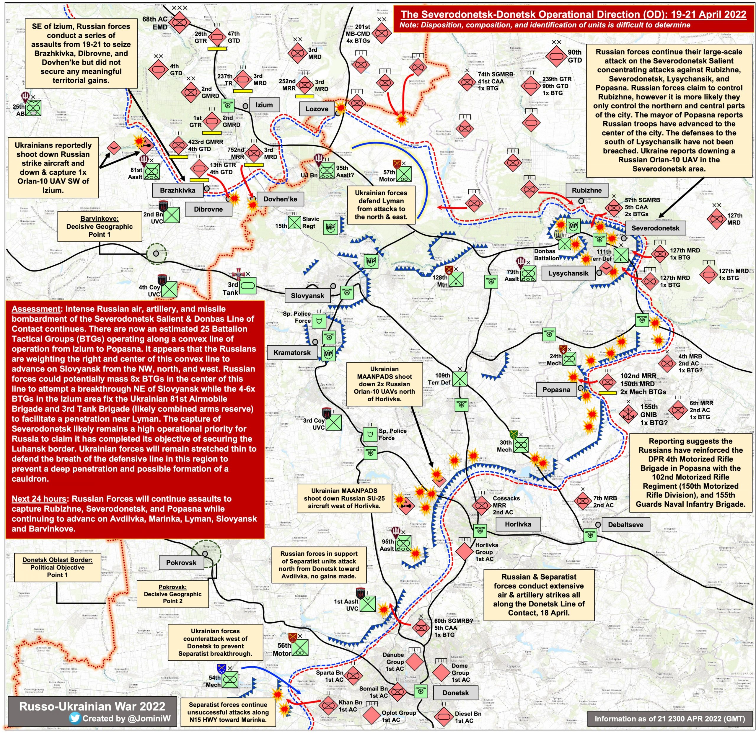 - Donetski ja Tavrijski suunal on vastase peamised jõupingutused suunatud Popasna, Rubízhne asulate kontrolli alla võtmisele ja Severodonetski linna ründamise ettevalmistamisele.