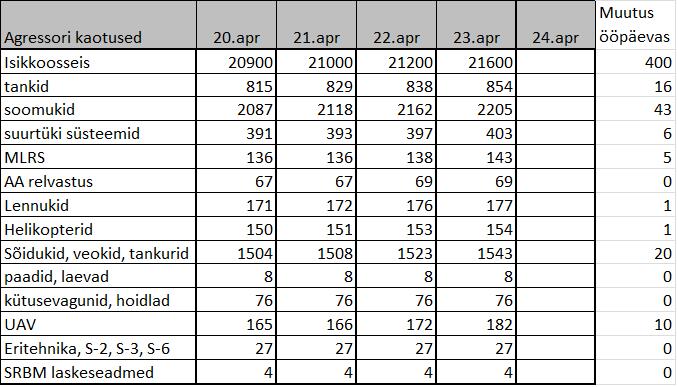 - Donetski ja Luganski oblasti territooriumil on viimase 24 tunni jooksul tagasi löödud kaheksa vaenlase rünnakut, hävitatud üheksa tanki, kaheksateist soomustatud ühikut ja kolmteist autotehnikat, kütusetanker, kolm suurtükiväesüsteemi.