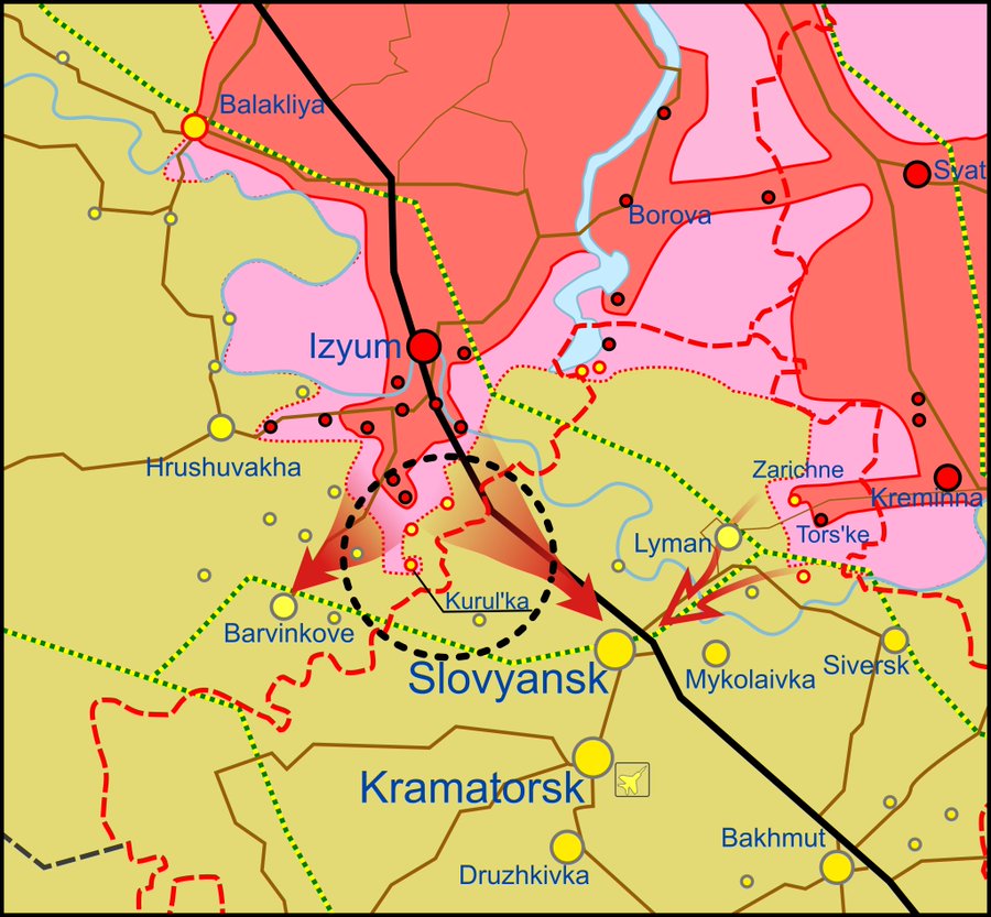 - Vene väed on tunginud Izyumist lõunasse ja on vallutanud pärast mitmeid katseid Dibrovne linna ning jätkanud Kurulka ründamist mille Ukraina tagasi tõrjus. Võitlus Zavody äärelinnas jätkub, ukr jätkab rünnakute tõrjumist.