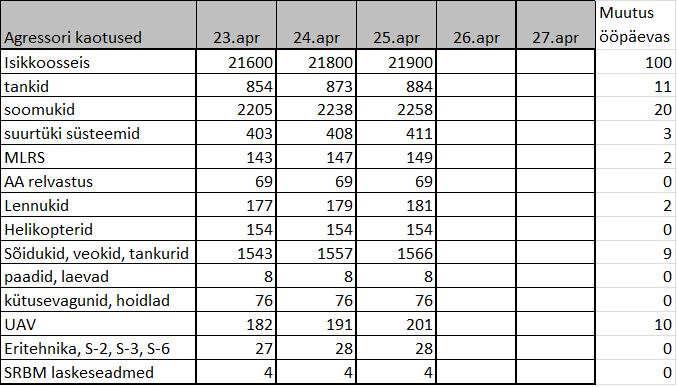 UKR hinnang agressori kaotustele. Vastase suurimaid kaotusi täheldati eile Severodonetski suunal, VF 2. armee 30. Üksiku motolaskurbrigaadil. Tundub, et idas on vatnikud paigal tammunud. Nüüd vist hakkavad katsetama Krõvõi Rigi ja Zaporozje suunal. Seal on fikseeritud üksuste koondamist.