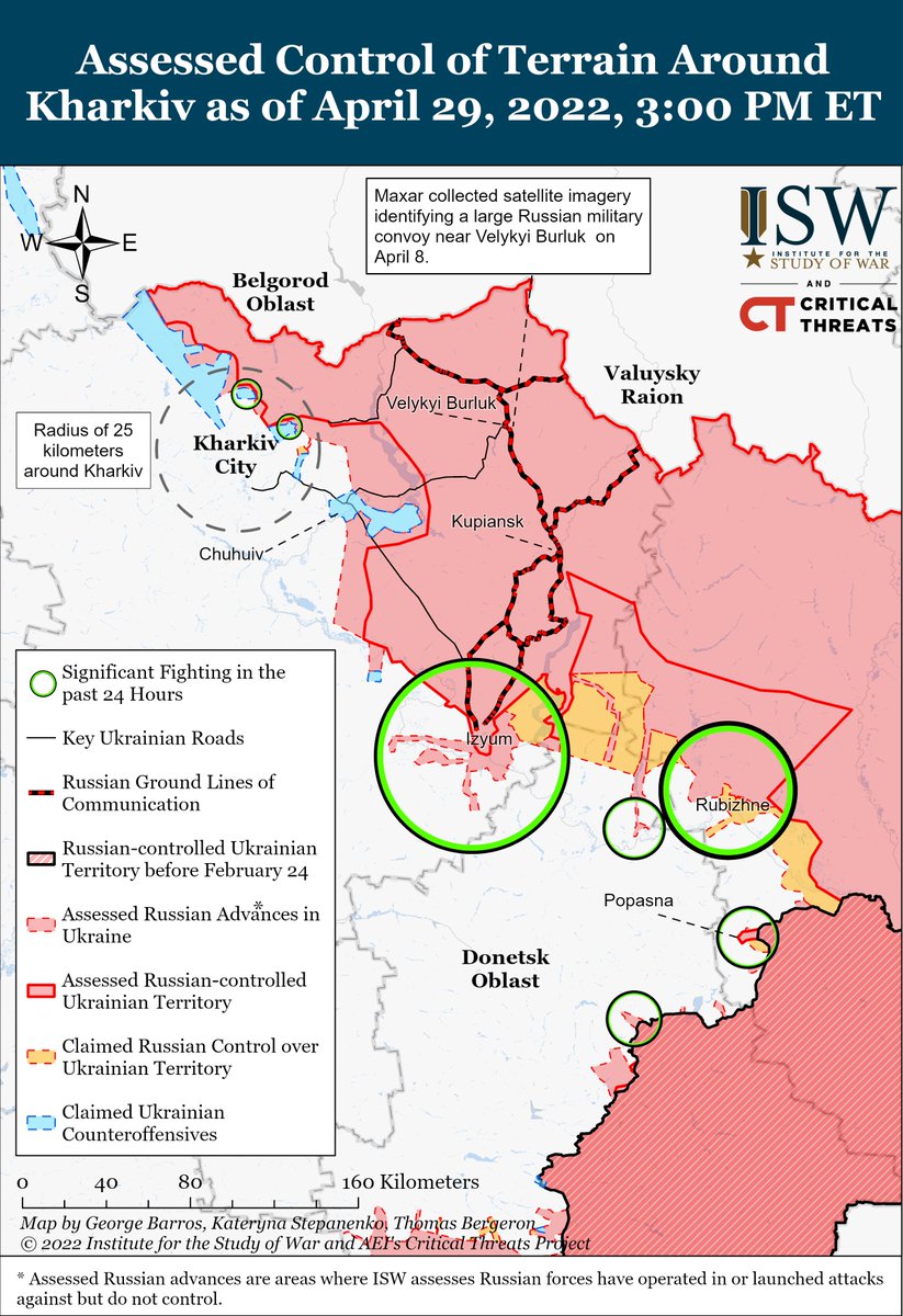 Lisatud: Paar päeva vana kaart idarindelt aga selline on ka olukord täna. Ringidega on märgitud venelaste rünnakute suunad. Kollased alad on need mis vene on viimase paari nädala jooksul hõivanud ja sinised need, mis Ukraina on vasturünnakutega tagasi võtnud. Ühe koha kohta, Oskil, pole uut infot saanud. Linn asub Oskil jõe idakaldal lõuna pool Borovat. Paar päeva tagasi oli inf, et selles asuvad väed on ümberpiiramise ohus. Tegelikult vist ongi piiratud aga ukrainlased on ka selle koha kohta vait.