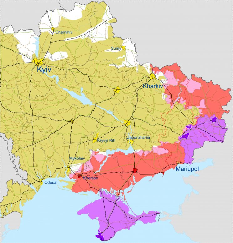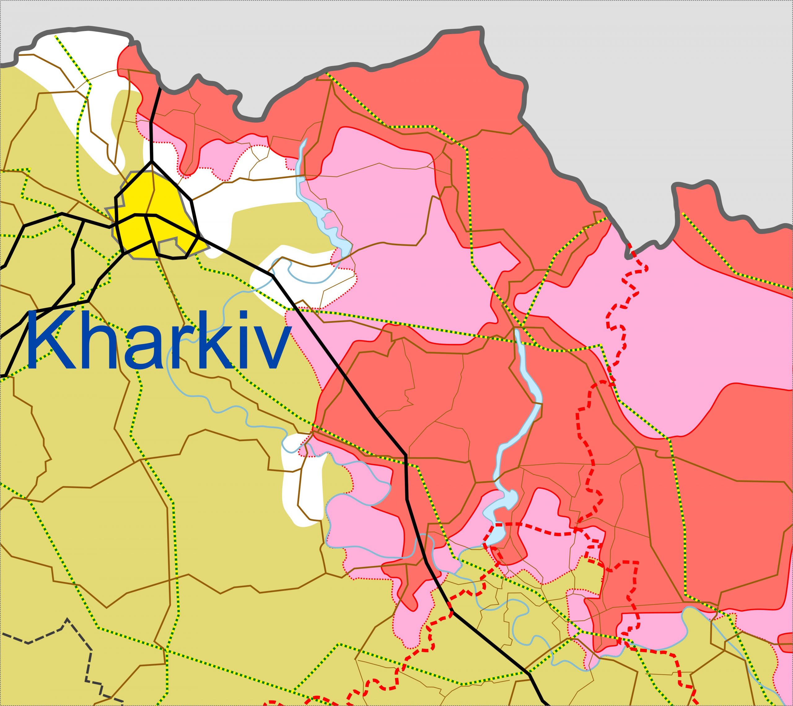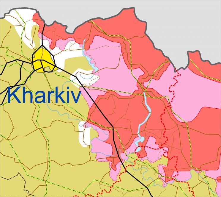 Üks kaart millel on valgega märgitud alad, mis UA on okupantide käest tagasi võtnud. Päevased taktikalised muutused on väikesed, ja seda ei pane tähele. 05 mail kogemata välja lobisetud vasturünnakud Harkivi ja Izjumi all on märgata.