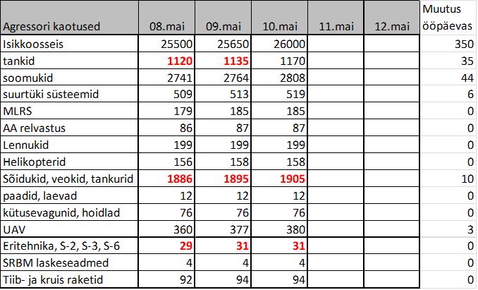• UKR hinnang agressori kaotustele. Ukrainlased on pika vinnaga. Olen neile teada andnud nende matemaatilistest vigadest. Tankide rea nad parandasid täna ja tegid selle 1 mail. Näis kuidas nad klaarivad +94 soomukit ja +10 eritehnikat. Ps! 25 tanki ei paistnud eilsetest op suundade ettekannetest küll välja. Samas kaks kolm päeva tagasi võeti rajalt maha umbes 3-4 bontoonsilla masinat ning seda ka näha pole.