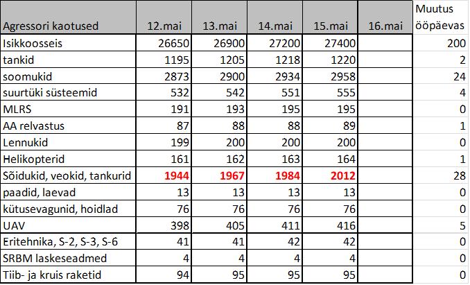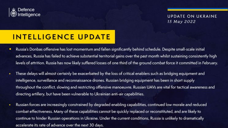 • UK luure hinnang. Kolmandik maaväe lahingvõimest on venelased kaotanud võrreldes sõja algusega. Olulised kaotuses on CSS valdkonnas; luure- ja vaatlus vahendid, pontoonsillad, UAV-d.