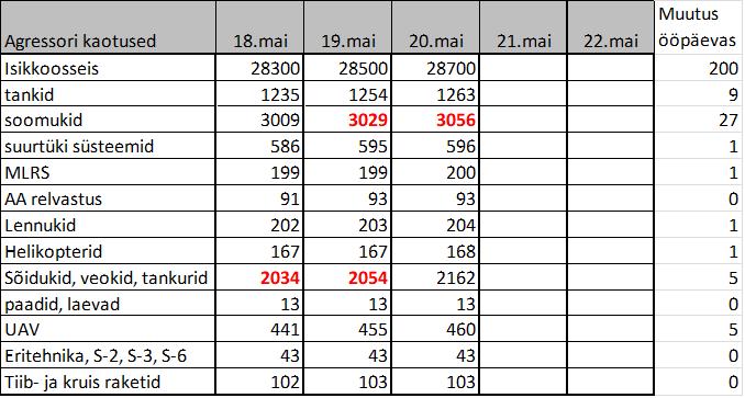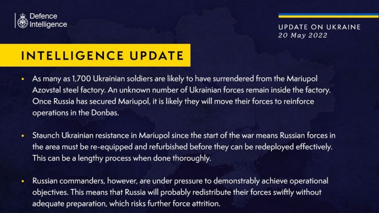 • Briti luure nimetab asju nii nagu need on. Umbes 1700 ukrainlast on alla andnud Azovstalist. Kas kokkulepe putinlastega, et nad vahetatakse vatnike vastu, peab, näeme tulevikus. Britid ütlevad, et Mariupolist vabanevad vatnike üksused lähevad Donbassi ja tõenäoliselt ilma nende lahinguvõimet taastamata kuna poliitiline juhtimine nõuab.