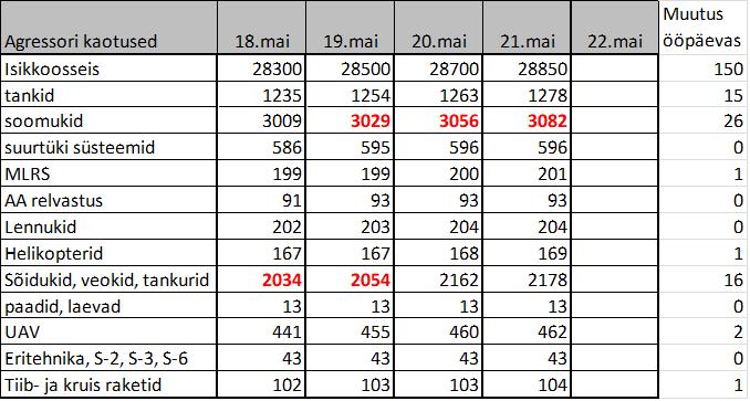 • Ainuüksi Donetskis ja Luganskis on viimase ööpäeva jooksul tõrjutud 11 vaenlase rünnakut, hävitatud on kaheksa tanki, kolm suurtükiväesüsteemi, kümme ühikut soomukite lahingumasinaid, kolm erisoomukit ja kuus ühikut vaenlase masinaid.