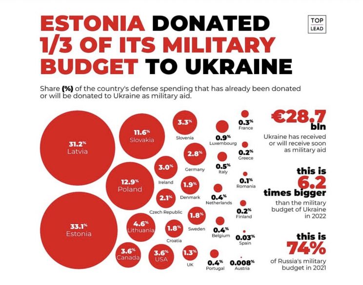 - Eesti andis kolme kuuga Ukrainale üle kolmandiku oma sõjalisest eelarvest. Asepresidendi juhi Mihhail Podoliaki nõuniku sõnul on see “maailma suurim”. „See tõestab veel kord: sa võid olla väike riik, aga sul on suur süda, ja sa võid olla suuruselt teine, aga sul pole seda üldse,” ütles ta.