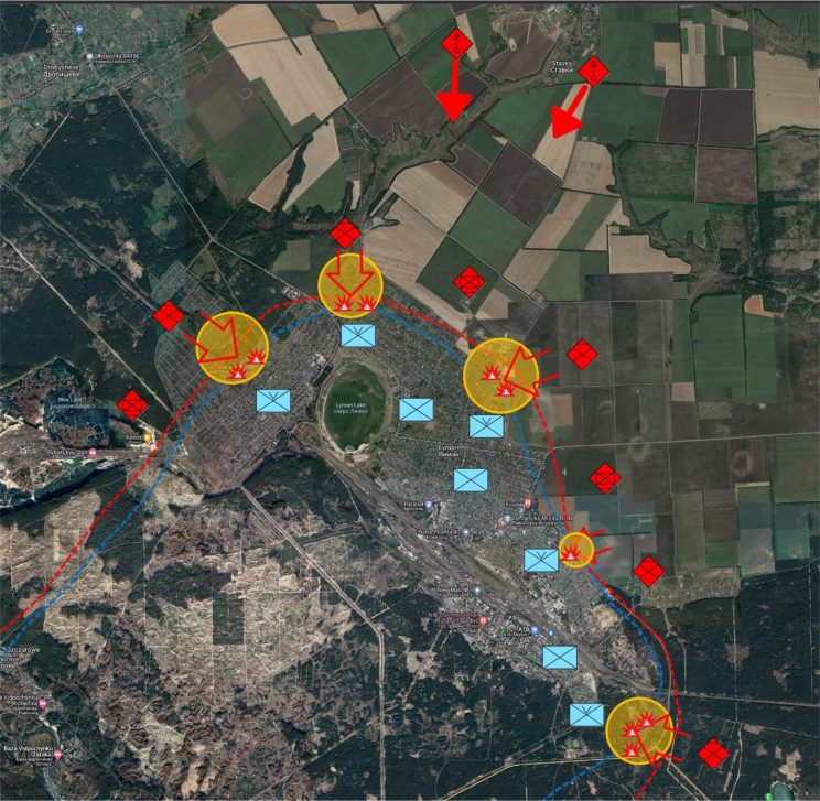 - Limani suunas käib aktiivne lahingutegevus. Suurtükiväe ja õhurünnakute toel juhib rünnakut Limani asula poole.