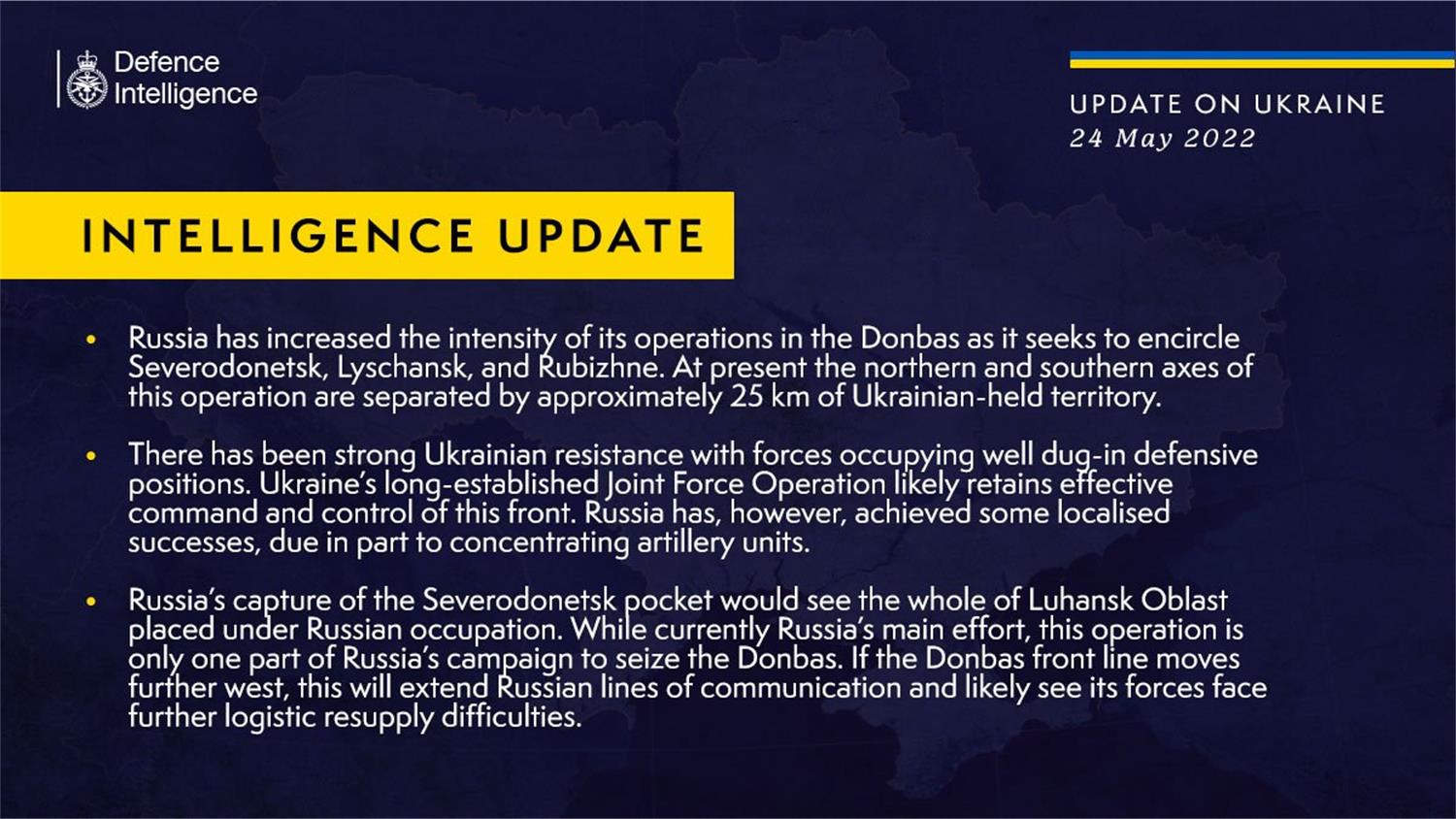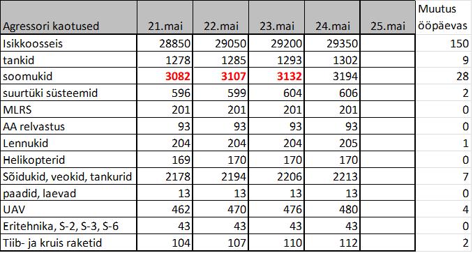 Tundub, et idarindel hakkab ukrainlaste kaitse järgi andma. Sellele viitab nii ukrainlaste väljaõeldu kui ka info operatsiooni alalt. Kuigi isikkoosseisu suhtarvu poolest poleks nagu probleeme siis Zelensky rääkis eile, et tehnikas on RU-l 20x ülekaal. Zhdanov ütles eile õhtul, et UA tõi Bahmuti suunal reservid juurde ja agressori pealetung on peatatud. Arestovich hiljem, kes tõenäoliselt oli ise samas piirkonnas, nii optimistlik ei olnud. Eile õhtul agressor sisenes Lymani. Hõivamist veel ei kinnitata ja lahingud käivad. RU hõivas Bahmuti suunal Vasylivka küla. Pealetung Severodonetski hõivamiseks algas kolmest küljest. RU suutis linna NEE servas kanda kinnitada. Harkovi suunal läksid ukrainlased nädal tagasi liiga hoogu. Agressor viis sinna täiendavad üksuseid, väidetavalt 2 mehhaniseeritud pataljoni ja tugevdas kaudtule võimet. Nüüd on olukord viimased 3 päeva olnud üsna staatiline.