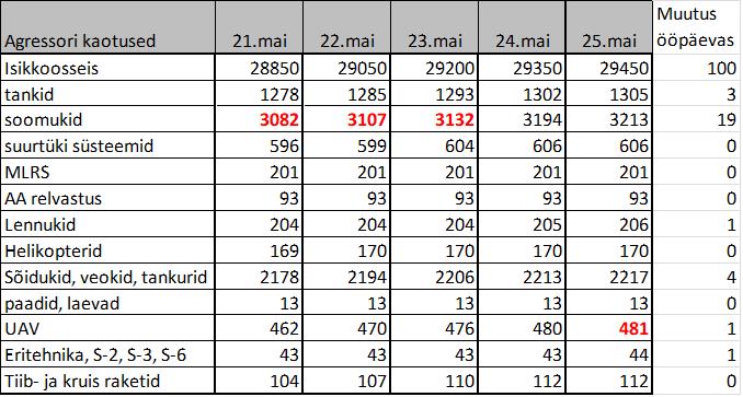 - Möödunud ööpäeva jooksul tõrjuti Donetskis ja Luganskis tagasi üheksa Vene sissetungijate rünnakut, hävitati kolm tanki, kaheksa suurtükiväesüsteemi, kaheksateist ühikut soomus lahingumasinaid, üks erisoomuk ja üks ühik muid sõidukeid.