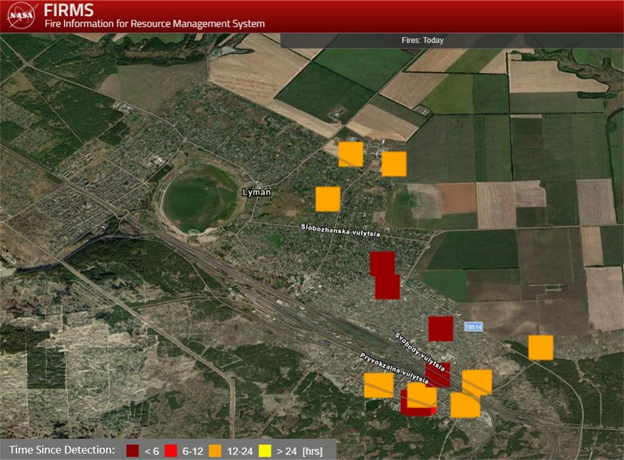 - Lymani suunas intensiivistas vaenlane sõjategevust. Suurtükiväe ja õhutoetusega tungib peale Lymani küla piirkonnas. NASA kaart tulekahjudest mis viitavad lahingute asukoha kohta Lymanis.