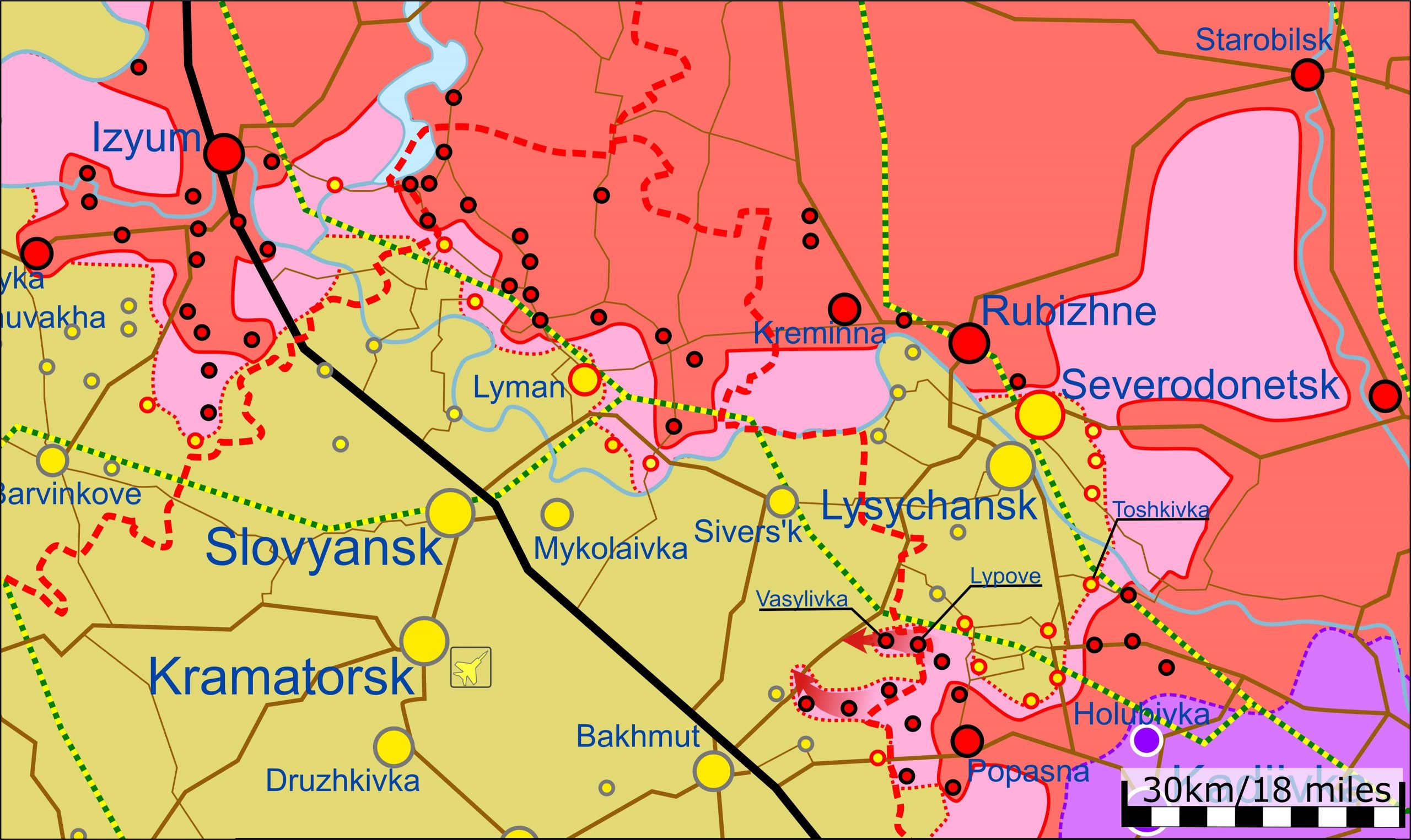 Agressor saavutas kontrolli Lypove ja Vasylivka (NW Popasna) üle ja kontrollib Bahmuti – Lõsõtšanski maanteed. UA sisenes uuesti Toshkivka asulasse ja lahing käib. UA osalise kontrolli all on veel üks tee Severodonetskist välja läbi Lõsõtchanski Siverskisse kuid selle kasutamine on küsitav kuna see on vatnike suurtükitulega kaetud. Ehk siis järjekordne piiramisrõngas.
