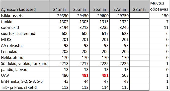 • Viimase ööpäeva jooksul on Donetski ja Luganski suunal tõrjutud 12 vaenlase rünnakut, hävitatud on tank, viis suurtükiväesüsteemi, viis ühikut soomuslahingmasinaid ja viis autot. Õhutõrjeüksused tulistasid alla vaenlase helikopteri Ka-52, tiibraketi ja UAV-i Orlan-10.
