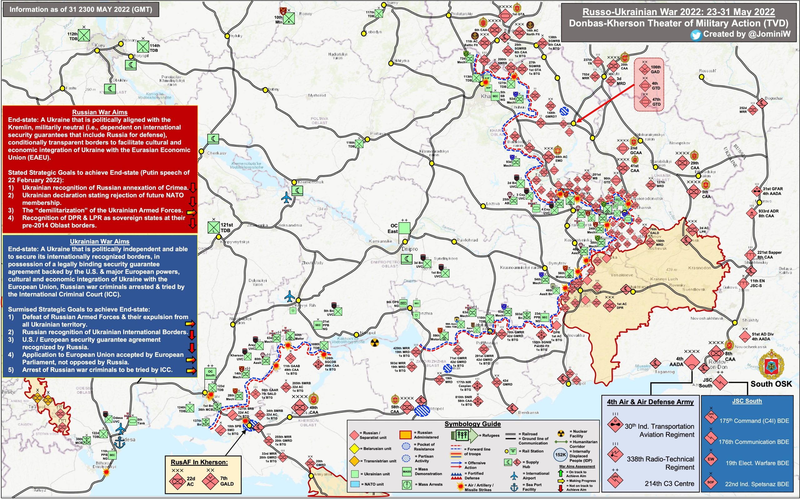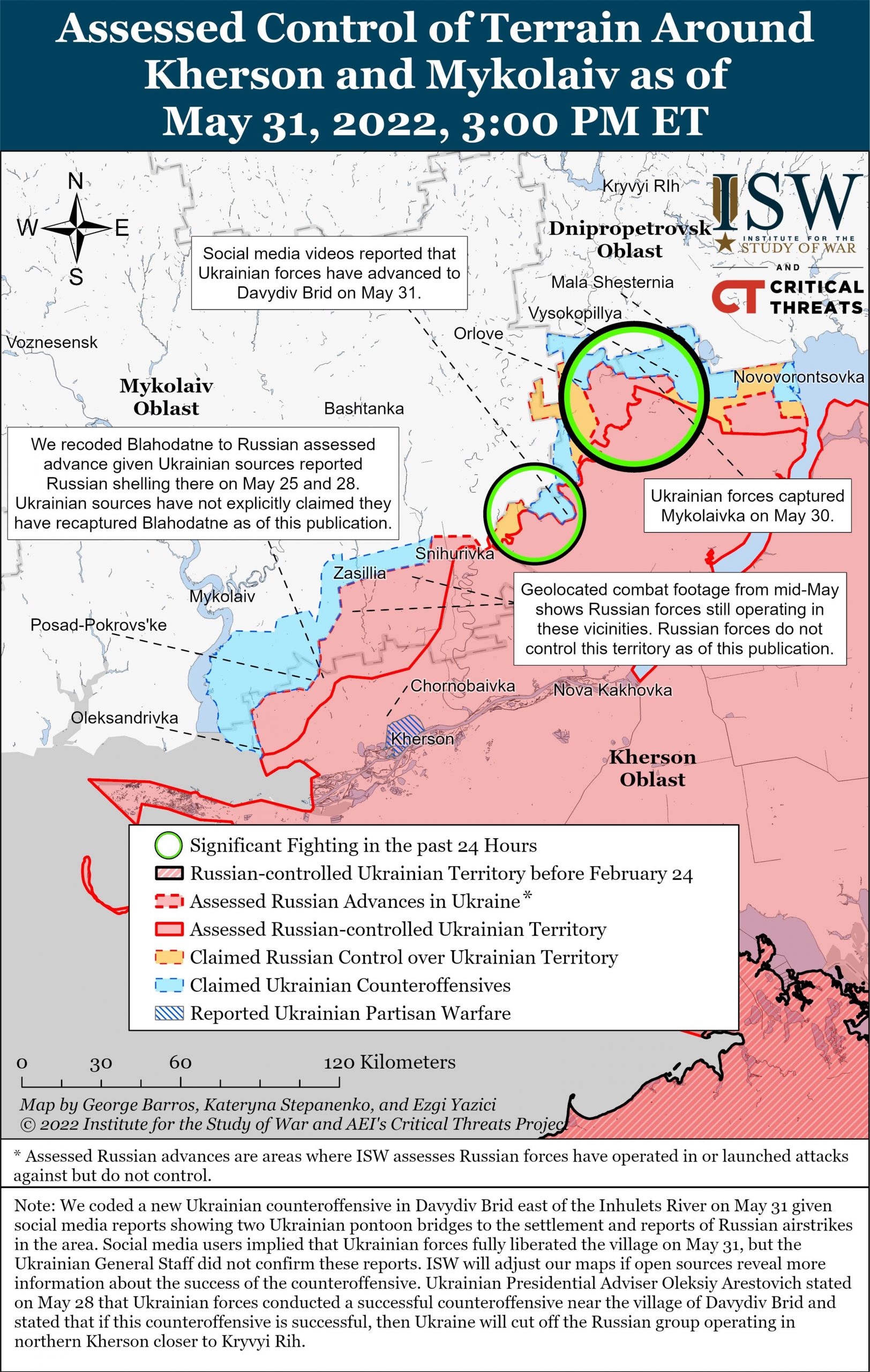 • Ajutiselt okupeeritud aladel jätkab vaenlane meetmete rakendamist Ukraina kodanike õiguste ja vabaduste piiramiseks, liikumise piiramiseks, filtreerimismeetmete elluviimiseks ja humanitaarkriisi süvendamiseks. Vene sõjaväelased röövivad tsiviilelanikke. Mõnes asulas korraldab vaenlane kahjustatud sõjatehnika taastamist kohalike ettevõtete rajatistes. Nii korraldati sõjatehnika remont Berislavi linnas Berislavi masinaehitustehases.