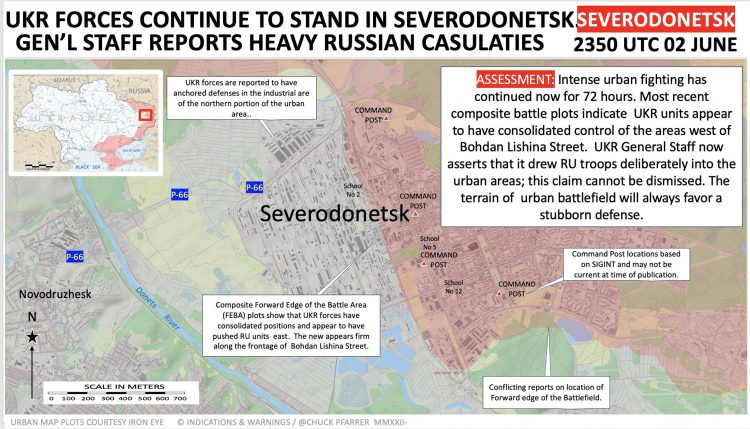 • ISW: Vene väed saavutasid 2. juunil Ida-Ukrainas minimaalset ent ressursikulukat edu. Jätkasid Severodonetski vallutamist ja edasisi operatsioone Lõssõtšanski vallutamiseks. Venemaa sõjaline juhtkond kasutab tõenäoliselt nende kahe linna vallutamist väitmaks, et nad on enne Donetski oblasti „vabastamist“ kogu Luganski oblasti “vabastanud”, kuid tõenäoliselt ei ole Vene vägedel Donetski oblastis märkimisväärse territooriumi hõivamiseks vajalikke jõude pärast kaotuseid Severodonetskis. Vene vägesid piirab ilmselt Donbassi maastik ja nad seisavad silmitsi väljakutsetega Siverskyi Donetsi jõe ületamisel, et viia lõpule Severodonetsk-Lõsõtšanski ümberpiiramine ja liikuda edasi Lõmanist läände Slovjanski poole Raihorodoki kaudu.