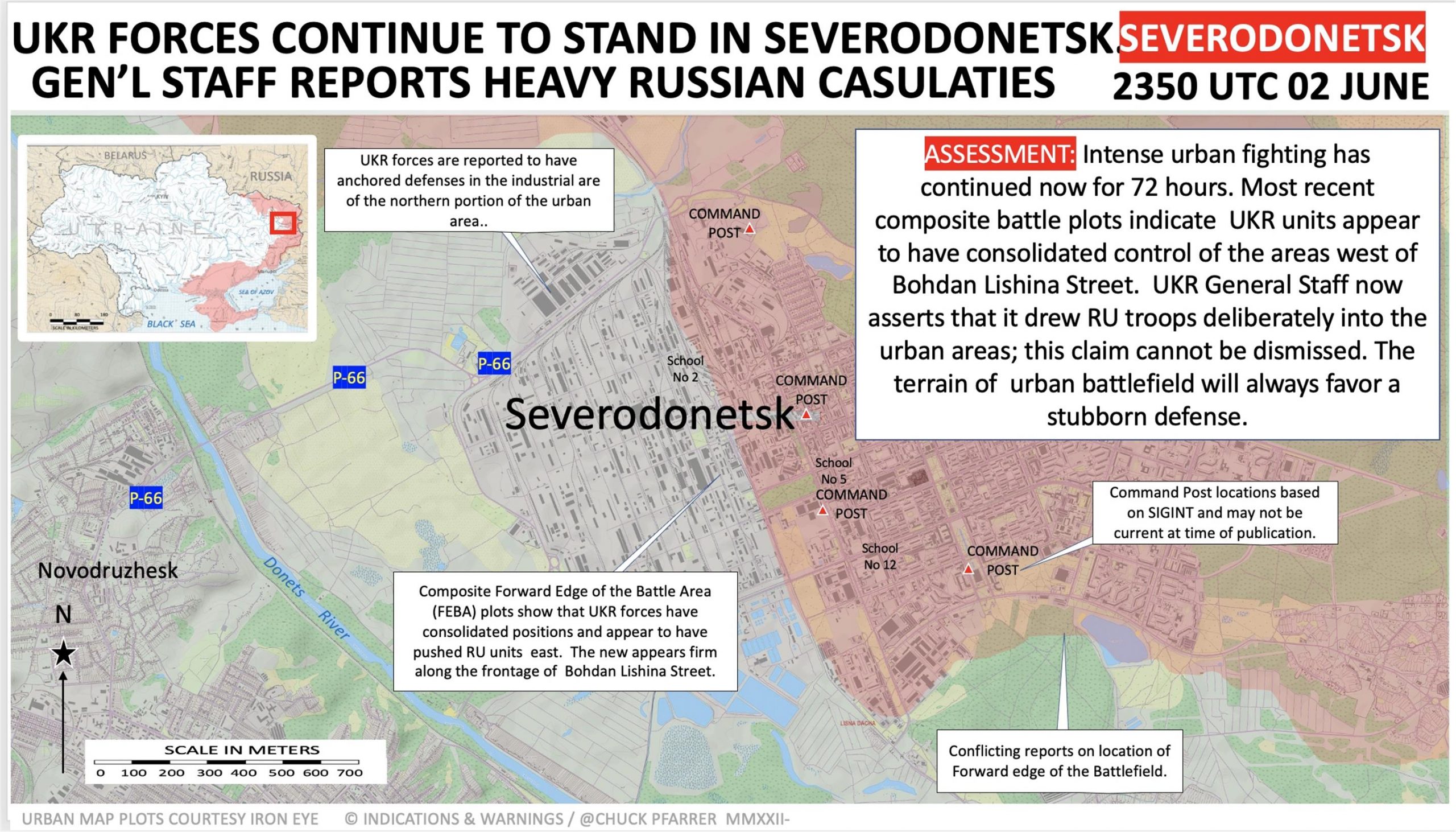 • Lahingud Siverodonetski keskosas jätkuvad. Ps! UA väed jätkavad linnapiirkonnas märkimisväärset positsiooni. Kontaktliiniks on nüüd teatatud kui Bohdan Lishina tänav, keskne puiestee. RU kaotused on teatavates piirkondades taandumisega suured. Linna lahinguväli soosib UA kangekaelset kaitset.