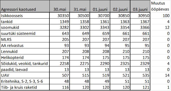 • Siverodonetski suunal jätkavad sissetungijad kaitseväe positsioonide ja tsiviilinfrastruktuuri tulistamist Siverodonetski, Borivske, Ustynivka ja Lüsõtšanski asulate piirkonnas. Vaenlase ründelennukid alustasid Myrna Dolyna lähedal õhulööke. Lisaks üritas vaenlane Mietolkino ja Bilohorivka piirkonnas läbi viia rünnakuoperatsioone, kandis kaotusi, taandus varasematele positsioonidele.