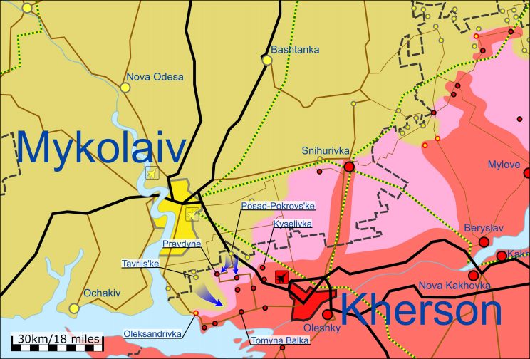 Ps! Väidetavalt sooritas UA vasturünnakud Hersonist läänes ja loodes, keskendudes Tomyna Balka ja Pravdyne suundadele. On ka väiteid, et UA on jõudnud Kyselivkast kaugemale. Arestovich mainis, et hävitati isikkoosseis, 4 haubitsat, 5 KAMAZ-i, laskemoona ladu ja S-400.