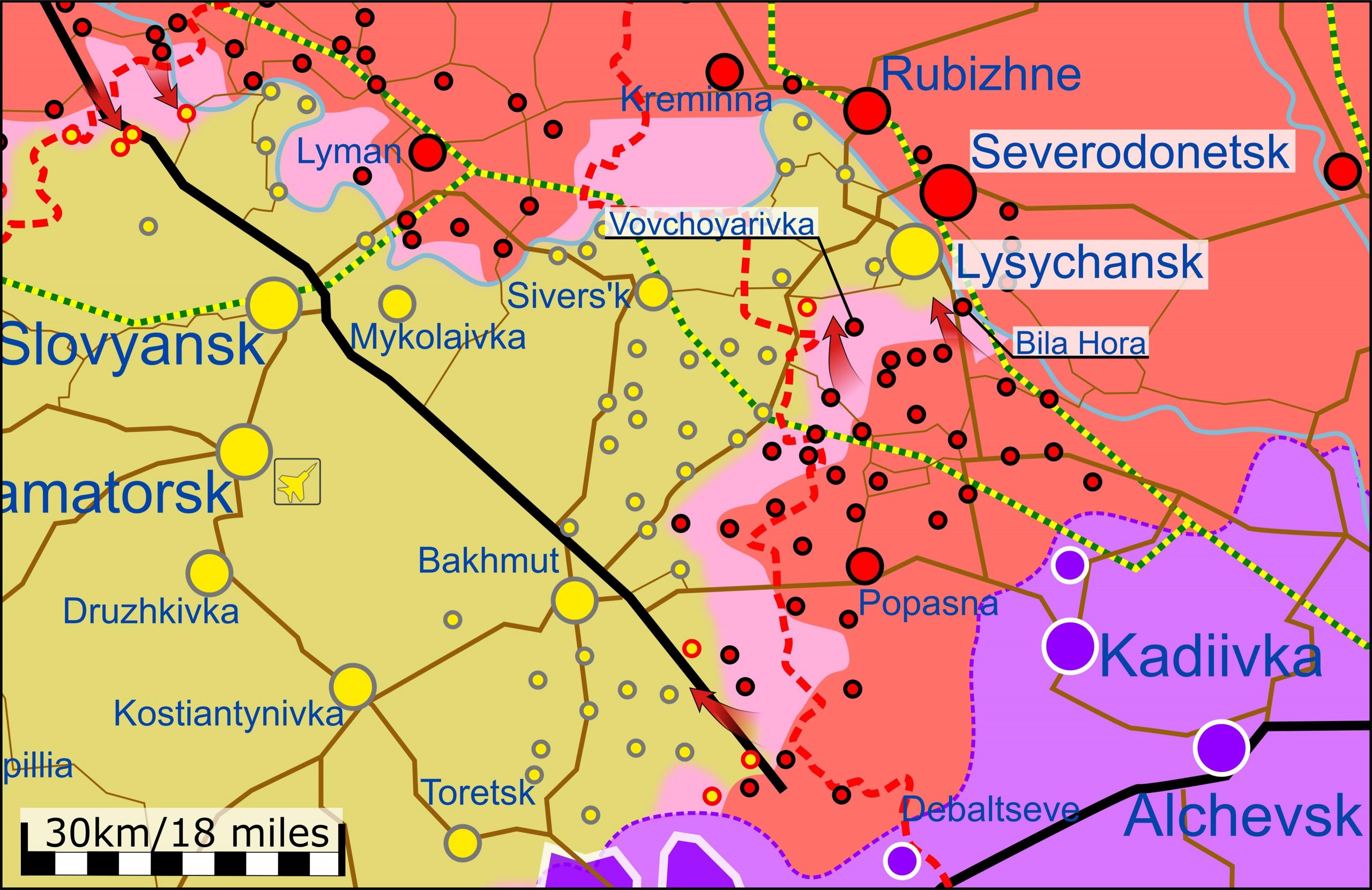 - Vaenlane ründab Vovčoyarívka suunas – Lysičanski rafineerimistehase lõunaservas, võitlus käib.