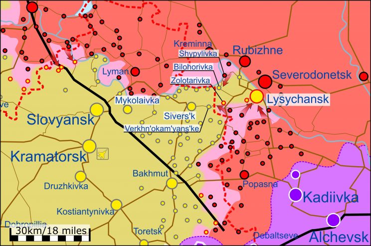 - Lõsõtchanski suunal: Ukraina väed taganesid Pryvilliast. Vene väed vallutasid linna ilma võitluseta. Vaenlane vallutas Lysõtšanski naftatöötlemistehase kaguosa, võitlus jätkub tehase sees. Vene väed liikusid edasi Topolivka poole ja jõudsid äärelinna. Vaenlane jõudis ka Maloryazantseve äärelinna, mis asub Lõssõtšanskist lõunas. Lahingud jätkuvad Lõssõtšanski lõunaservas, peamiselt tööstuspiirkonna servas. Lõsõtchanskist välja viib veel üks tee loode suunal. Edelas asuv Šõpilivka asula on vene kontrolli all.