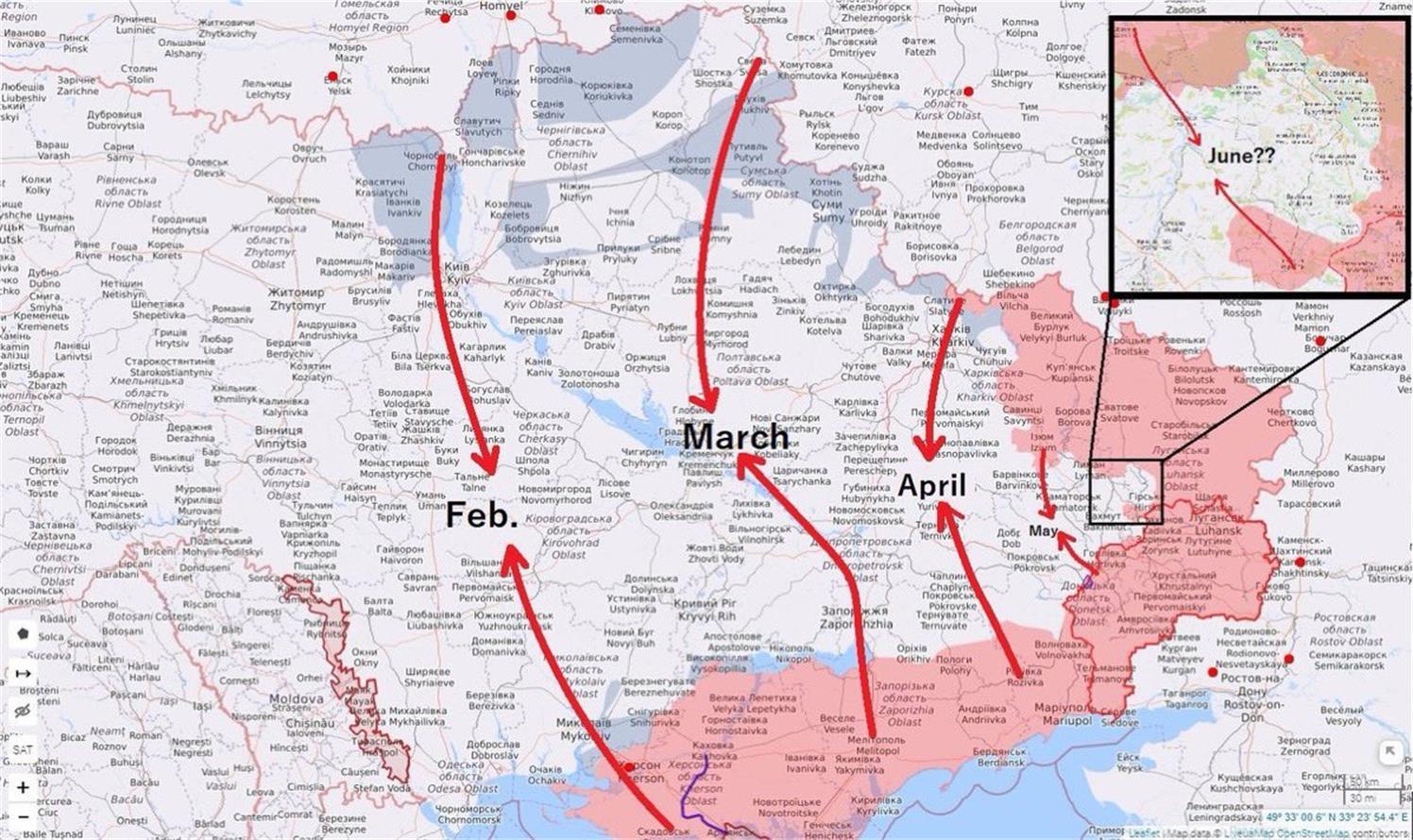 - Ilmselt kõik mäletavad neid ümberpiiramise plaane mis Kremlil on olnud. Kes ei mäleta siis kaardil on need näidatud. Avaldatud operatiivolukordades on sõja jooksul olnud ümber piiratud üksnes Mariupoli garnisoni üksused. Teised plaanid pole õnnestunud ja sõja jooksul on neid eesmärke russistid järjest vähendanud. Peale Luganski oblasti piirideni jõudmist aga kordas Venemaa Julgeolekunõukogu sekretär Patrušev, et Putini esialgseid eesmärgid Ukraina suhtes on jätkuvalt maksimalistlikud, sealhulgas režiimimuutuse ja territoriaalne laienemine kaugemale Donbassist.