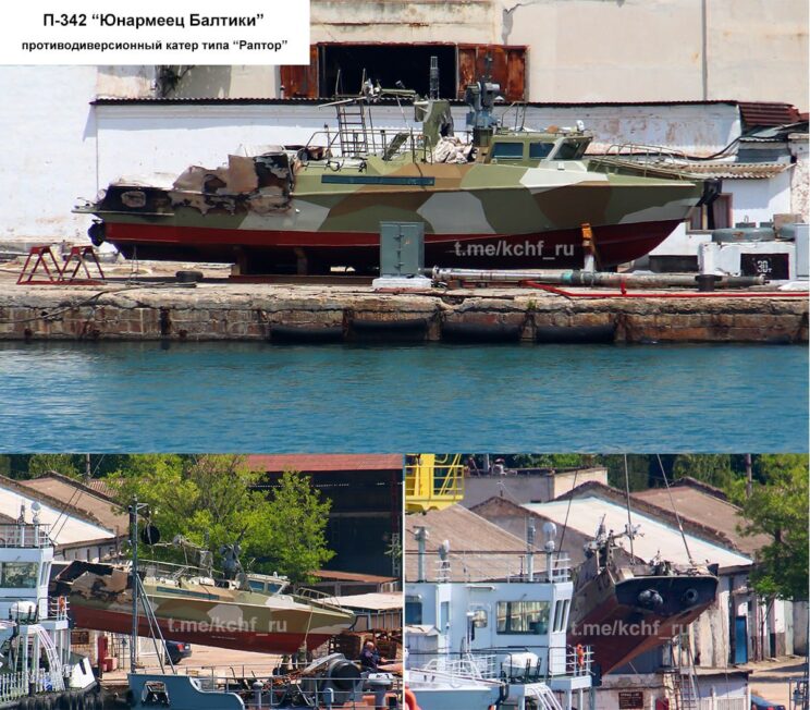 - Mustal merel pihta saanud Raptorid läksid kaotustena kirja kuid kõik pole veel kadunud. Üks patrullkaatritest, mis sai maikuus Ussisaare lähistel Bayraktari rünnakus kannatada, on nüüd toimetatud Sevastopolisse remondiks. Tabamuse on saanud mootoriruum. Paistab, et üks turbiin on ka küljest läinud. Korpuse remont on üks teema aga turbiinid, transmissioon ja mootorid on puhas lääne tehnika. Ilmselt on mootoriruum veekindlalt meeskonnaruumidest eraldatud ja paat põhja ei läinud. Ja ilmselt pole need Byraktri pommid ka eriti tugevad.