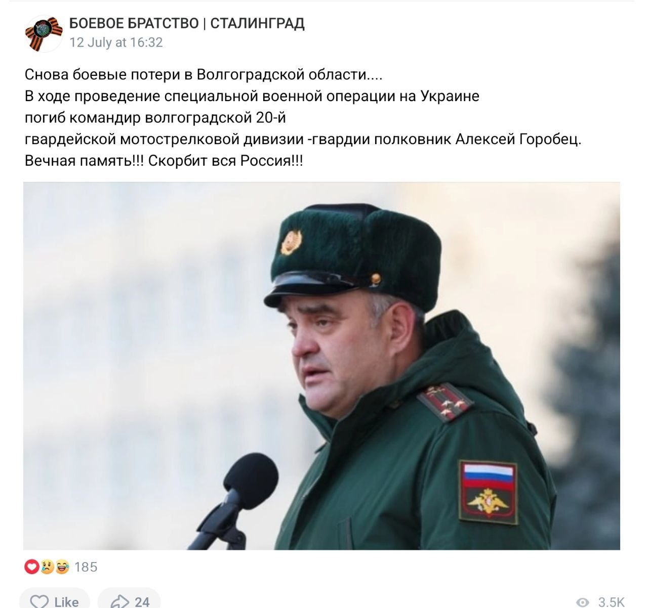 - 20. kaardiväe mootorrelvade diviisi ülema, polkovniku Aleksei Gorobetsi, liitumise Gruz200’ga kinnitas tema naine. See on muidugi huvitav, et russistidel juhivad brigaade ja diviise polkovnikud. Voi tuleneb see suurest kindralite suremusest.