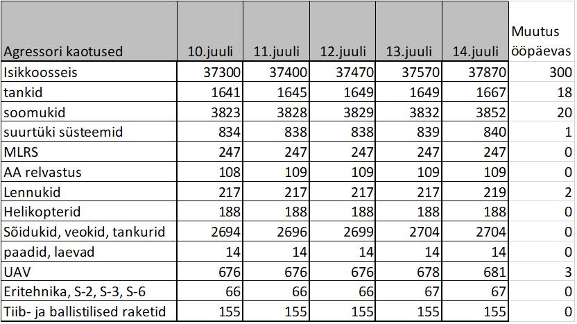 - 13. juulil demilitariseerisid UA relvajõud 5 vaenlase laskemoonaladu: Lugansk, Tšornobajivka, Hersoni piirkond, Makiivka, Donetski oblast, Chaplinka (rajoon), Hersoni piirkond, Horlivka, Donetski piirkond.