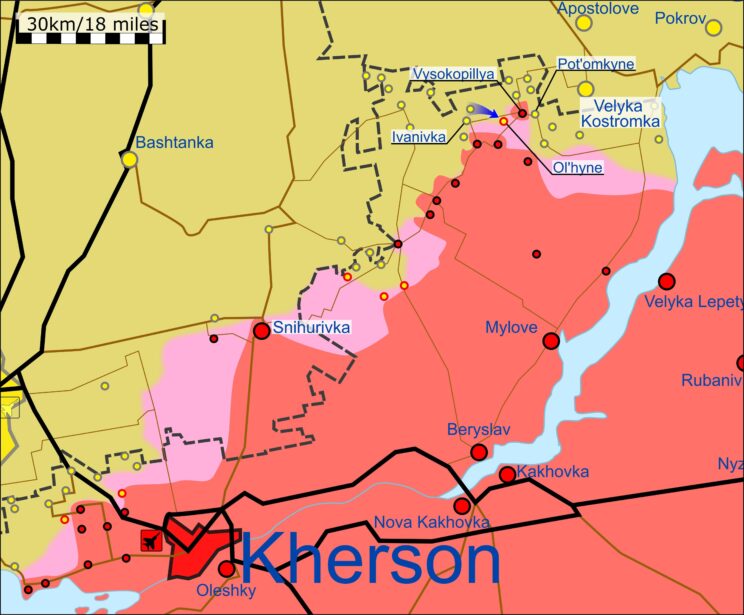 - Lõuna-Bugi suunal jätkab vaenlane varem hõivatud positsioonide kaitsmist. Vene väed korraldasid Hersoni-Mykolaivi oblasti piiri lähedal lokaliseeritud maapealseid rünnakuid. Ps! väidetavalt hoiavad Ukraina väed endiselt sillapead Inhuletsi jõel Lozove lähedal. Ja väidetavalt UA on edenenud Hersoni oblasti põhjaosas. Agressori vägesid Võsokopillyas ähvardab ühendusteede katkestamine ja/või ümberpiiramine.