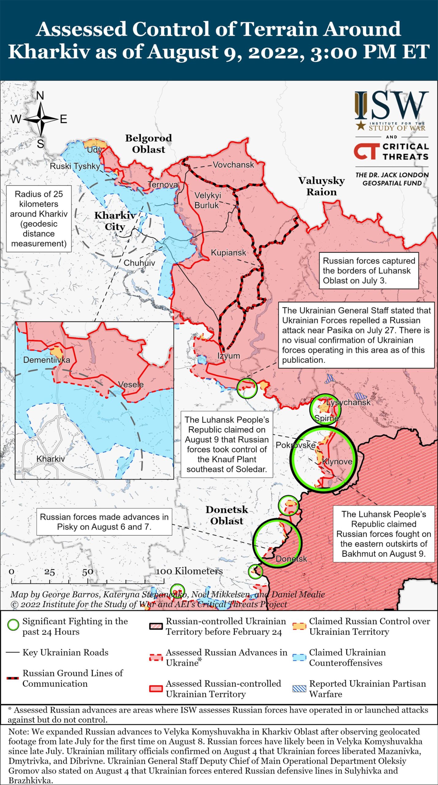 Operatiivolukord muutusteta kuigi muutuste hõngu õhus on. Viimaste päevade mitmed sündmused selle tekitavad. Eelmise nädala UA õhuväe poolt hävitatud kolm S-300 ja Panzir tekitasid juba küsimusi. Eile Zhdanov rääkis, et need hävitati rakettidega AGM-88 HARM millest kuulujutud meedias hakkasid levima alles 08. augustil. Ehk siis Ukrainal on relvastust mida ei teatud. Mis on hea sest üllatusmoment sõjas on üks edu kriteeriumeid. Rammstein-4 koordinatsiooni kohtumisel olla kokku lepitud, et relvatarnetest Ukrainale teatatakse peale seda kui relvad on kohale jõudnud. Lõpuks tuleb ka läänele mõistus pähe. Üleeile toimusid plahvatused russistide laos mis asub rindejoonest 151 km kaugusel. Kuidas? Jääb mõistatuseks. Eilsed plahvatused Sakõ õhuväebaasis Krimmis jäävad samuti mõistatuseks … esialgu. Venelased ütlevad, et õnnetus. Võib ju olla. Aegunud laskemoon võib iseeneslikult plahvatada ning plahvatus võib esile kutsuda veel teisi. Väidetavalt olla fikseeritud kuni 7 plahvatust. Ukrainlased rünnakut ei tunnista ja soovitavad tulega mitte mängida kuid märgivad ru kaotuste hulka 9 lennukit. Odessast 270 km kaugusel asuvat baasi, mis on üks kahest Krimmi õhuväebaasist kust Ukrainat rünnatakse, ei ulatu ukrainlased teadaoleva relvastusega ründama. Rammstein-4 otsus teadmisvajaduse kohta! Nii meedia kui ka sotsiaalmeedia on kindel – tegemist oli Ukraina rünnakuga. Versioonid alates partisanidest kuni rakettideni. Harpoon, HARM, ATACMS ja Grom-2. Isegi kui venelased õhuväebaasi koristamise käigus mõne raketijäänuse tuvastaks siis vaevalt, et nad rünnakut tunnistaks. Sest koos sellega tunnistaks nad ka vene õhutõrje võimetust ja poliitilist lõuahaaki Ukrainalt.