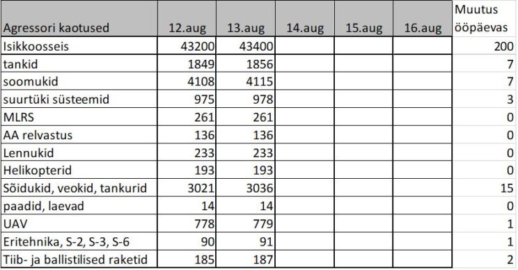 Operatiiv- ja sõjaga seotud informatsioon 13. augustil