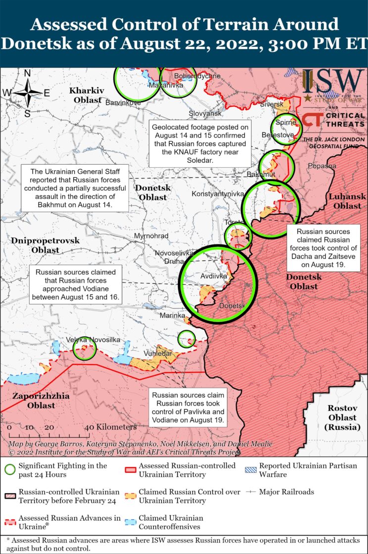 24-l augustil tähistab Ukraina iseseisvuspäeva ja Venemaa väed kavatsevad okupeeritud Mariupolis pidada Azovstali kaitsjatega nn tribunali. Ukraina luure teatas, et LNR alustab “üldmobilisatsiooni” protsessidega 1. septembril. Prymorsky krai teatas uue remondi- ja teeninduspataljoni moodustamisest. Ukraina partisanid jätkasid rünnakuid Venemaa vägede vastu okupeeritud Melitopolis.