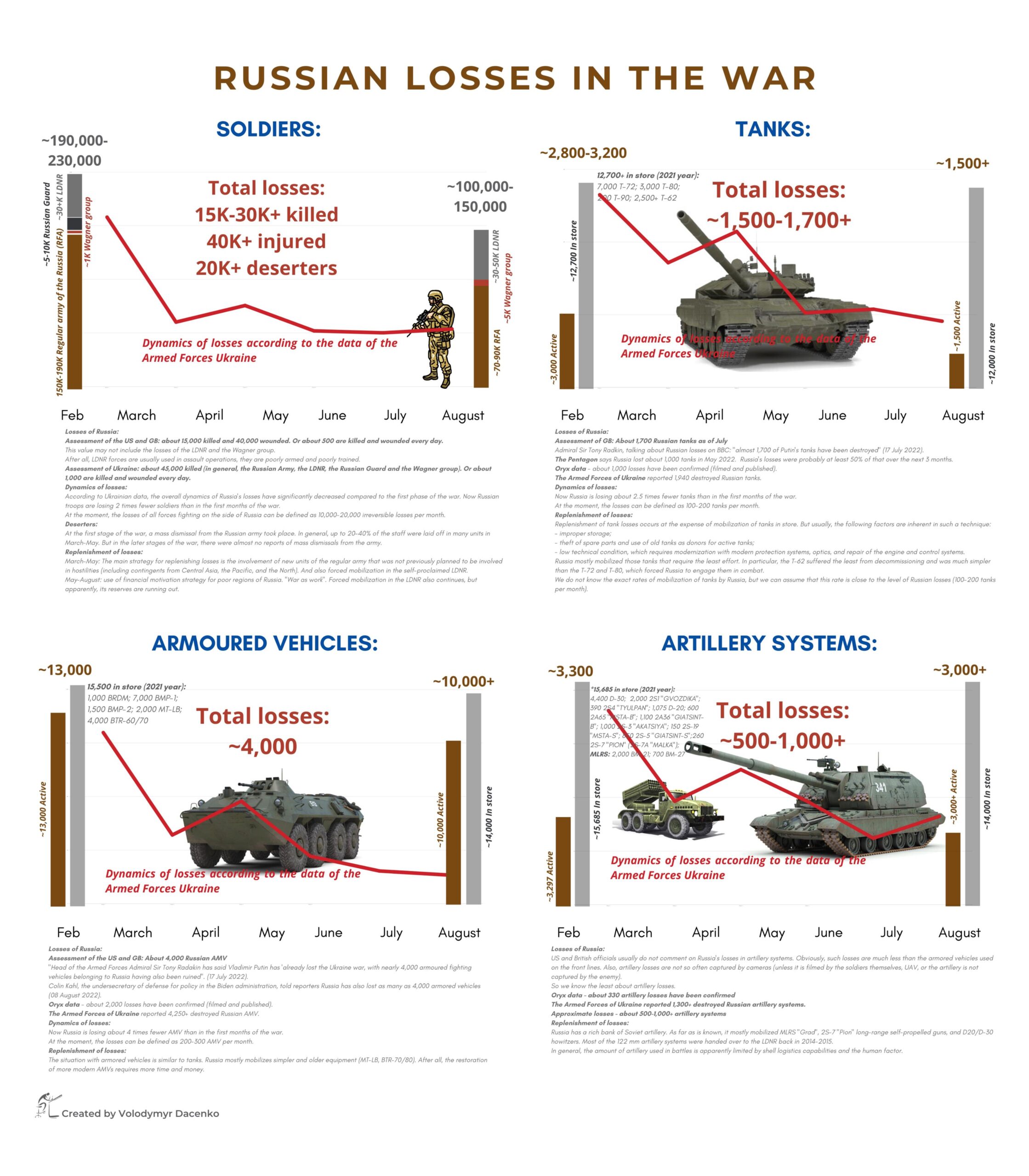 • Vene Föderatsioonil on asjad halvasti, on juba kulutanud vähemalt 55% oma reservidest Ukraina vastu suunatud rünnakutele, ütles GUR. Venemaal on rakettidega probleeme. Seega on Vene Föderatsioonis umbes 20% Iskandereid ja Kalibreid ning umbes 30–40 hüperhelikiirusega  Kinzale, kuna neil ei õnnestunud neid masstootmisse panna. Sellega seoses peab Venemaa kasutama X-22 ja S-300, kuid need raketid hakkavad otsa saama.