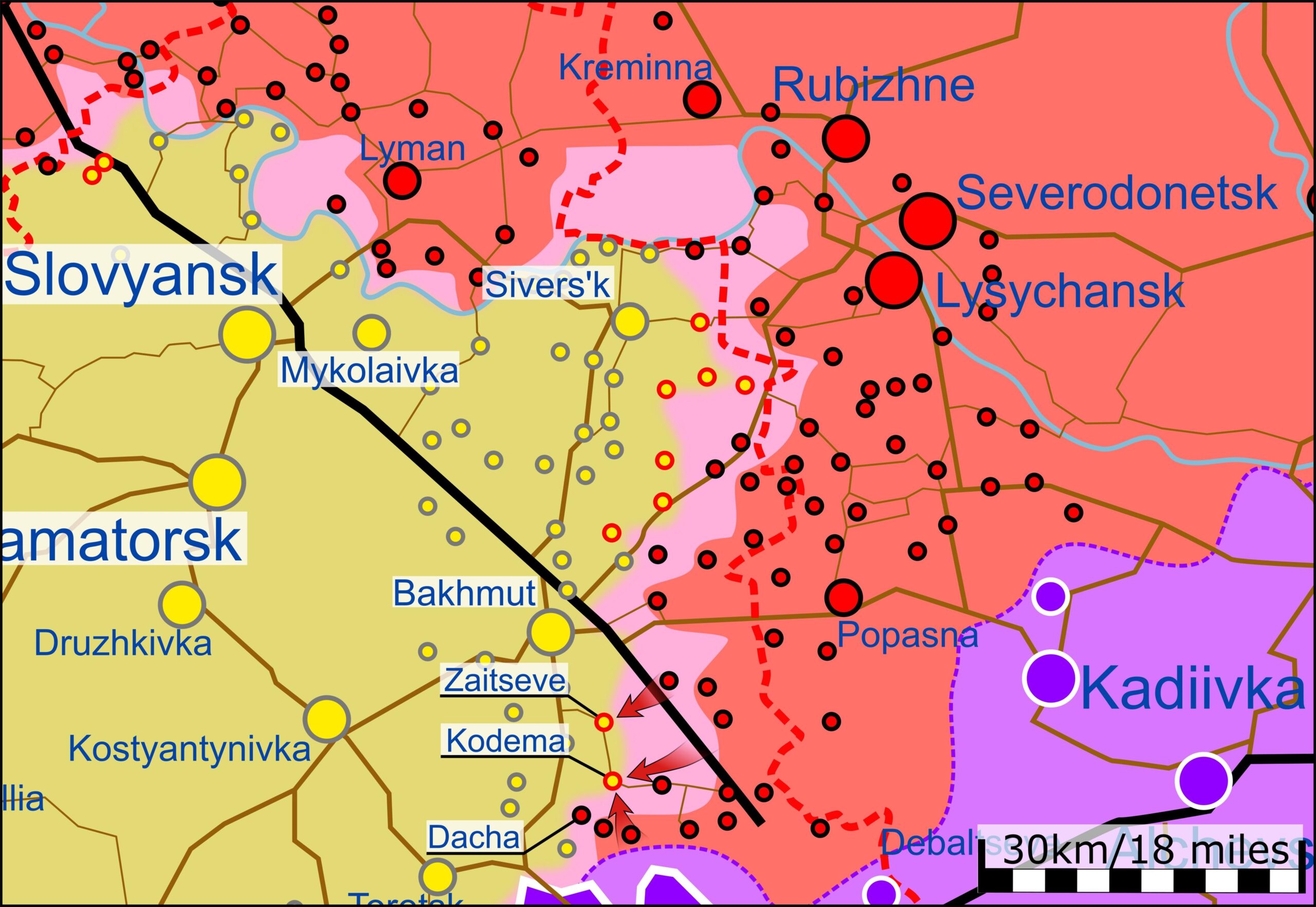 - Agressor on Kodemas, kuid ei ole veel suutnud kogu asulat kindlustada, tõenäoliselt tänu UA kindlustustele äärelinnas, kust avaneb vaade asulale ja selle lähenemisteedele. Kodemast läänes asuval kõrgel maapinnal on Ukraina vägede kindlustatud positsioon, kust avaneb vaade külale. Tõenäoliselt ei asunud asulas endas kunagi Ukraina vägesid.
