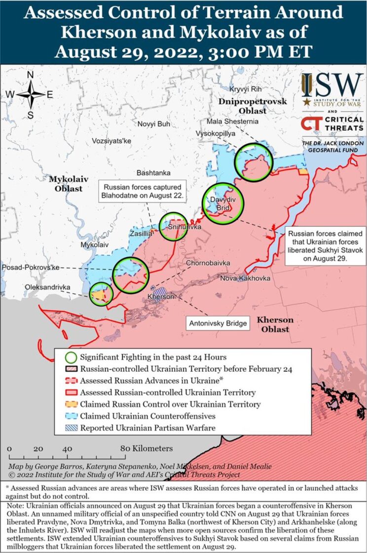 ISW: Ukraina sõjaväeametnikud teatasid Ukraina vastupealetungi algusest Hersoni oblastis 29. augustil. Ukraina ametnikud teatasid, et Ukraina väed on murdnud läbi esimesest kaitseliinist Hersoni oblasti määratlemata piirkondades ja püüavad ära kasutada Venemaa varustusteede katkemist. Pärast Ukraina HIMARS-i lööke mitme nädala jooksul. Ukraina ametnikud ei kinnitanud ühegi asunduse vabastamist, kuid mõned Vene ajaveebipidajad ja lääneriikidega vestelnud nimetud allikad väitsid, et Ukraina väed vabastasid mitu asundust Hersoni linnast läänes ja loodes, Ukraina Inhuletsi jõe sillapea lähedal ning Herson-Dnipropetrovskist lõuna pool. Venemaa kaitseministeerium, Venemaa volitatud esindajad ja mõned vene ajaveebi pidajad nimetasid Ukraina teadaande vastupealetungist “propagandaks”.